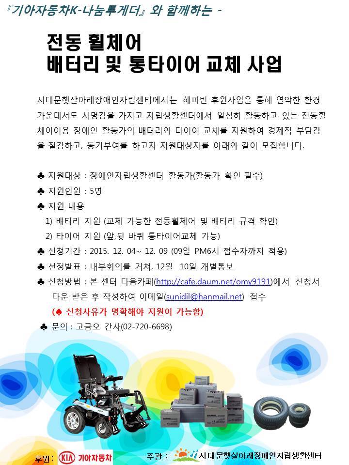 2015 전동 휠체어 밧데리 및 타이어 교체 사업 공고『기아자동차K-나눔투게더』전동 휠체어 배터리 및 통타이어 교체 사업